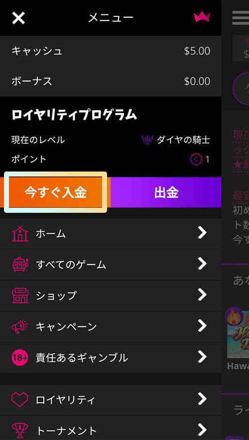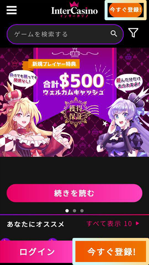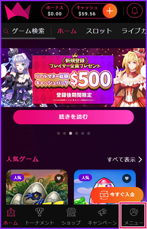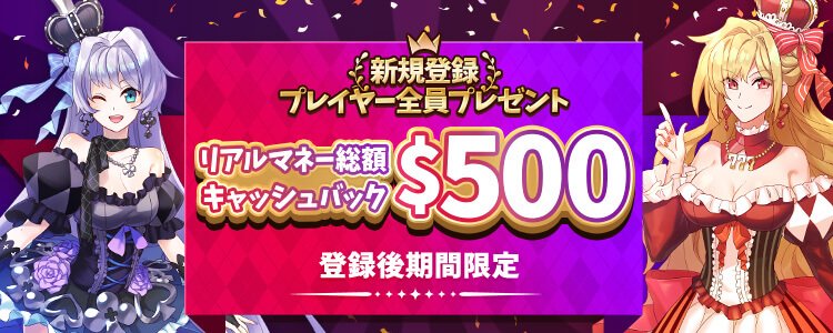 新規登録プレイヤー全員への特典、お好きなゲームでプレイするだけで、リアルマネー総額$500が戻ってくるウェルカムキャッシュバック。